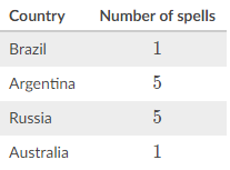 Gwendelyn, who is a witch, went on an international witch tour. The following table shows the number of spells that she cast in each country.