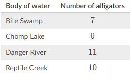 The following table shows the number of alligators in each body of water near Tom’s house.