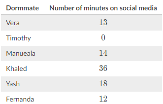 Guilherme observed the number of minutes his dormmates spent on social media sites while they were at the library. He reported his data in the following table.