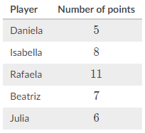 The following table shows the number of points scored last basketball game by each player on the Dragons basketball team.