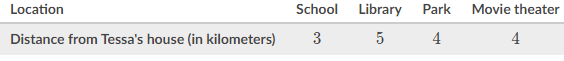 The following table shows the distance from Tessa’s house to her favorite locations.