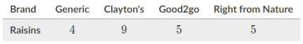 The following table shows the number of raisins in a scoop of different brands of raisin bran cereal.