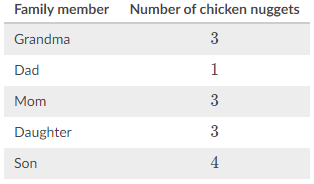 The following table shows the number of chicken nuggets on each family member’s plate.