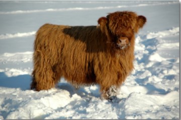 Complete the sentence with the most precise word to describe what is shown in the picture.The ….. calf stood waiting in the snow.