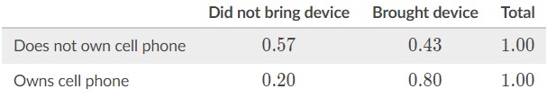 A survey of a random sample of ninth-grade students from Alabama asked whether the students owned a cell phone and whether they had brought a personal electronic device to use for schoolwork that day. The two-way table of row relative frequencies below shows the data.