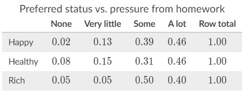 A survey asked students at Wilson Academy which status they would prefer—to be happy, healthy, or rich—and how much pressure they felt from their homework. The two-way table of row relative frequencies below shows the data.