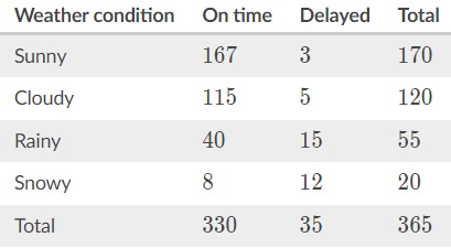 Alvaro is interested in the relationship between weather conditions and whether the downtown train runs on time. For a year, he records whether each day is sunny, cloudy, rainy, or snowy, as well as whether this train arrives on time or is delayed. Here are his results: