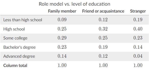 The two-way table of column relative frequencies below summarizes survey data on who a person’s role model is and their highest level of education.