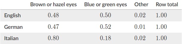 The two-way table of row relative frequencies below shows data on nationality and eye color.