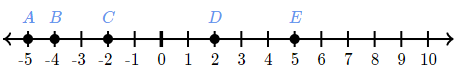 Which point represents the opposite of −5 on the number line?