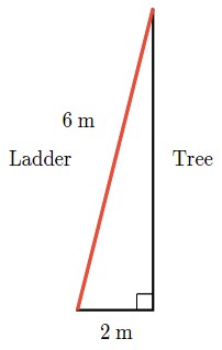 Kali has a 6 meter ladder that she wants to use to get her cat out of a tree. She puts the base of the ladder 2 meters away from the base of the tree.