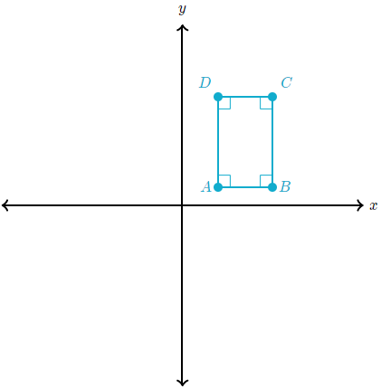 Rectangle ABCD is graphed in the coordinate plane. The following are the vertices of the rectangle: A(2, 1), B(5, 1), C(5, 6) and D(2, 6).