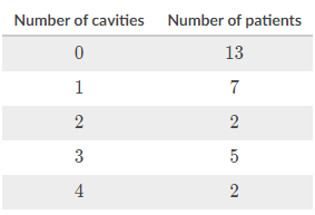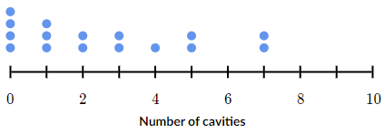 The following frequency table shows the number of cavities each of Dr. Freese’s patients had.