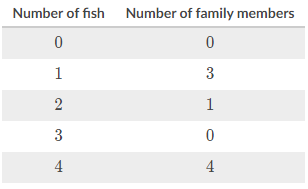 The following frequency table shows the number of fish caught by each of Igor’s family members.