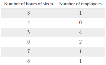 The following frequency table shows the number of hours of sleep that each of the staff members at Tia’s Toy Store got on Thanksgiving night.