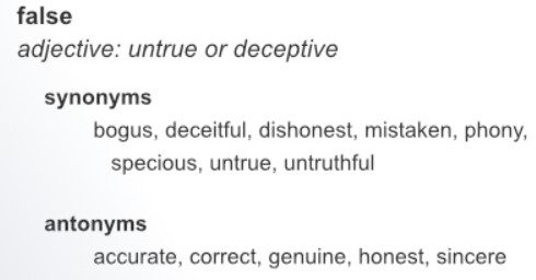 Click on the section of the thesaurus entry that shows words that have the same meaning as false.