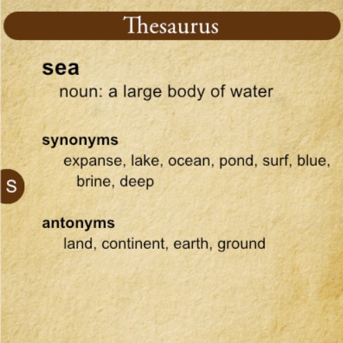 Click on the section of the thesaurus entry that shows words that have the opposite meaning of sea.