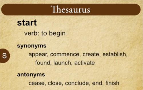 Based on the thesaurus entry, which words mean the opposite of start as it is used in the sentence below?The group will start their tour in a few minutes.