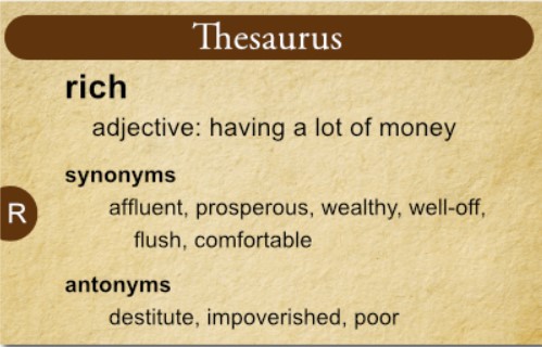 Based on the thesaurus entry, which words could replace rich in the passage below?Rachel’s family must be rich! They are going to travel across Europe this summer.