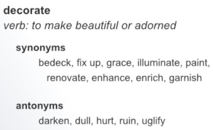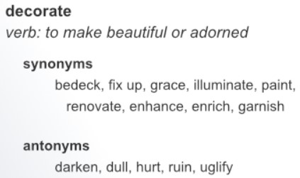 Click on the section of the thesaurus entry that shows words that have the opposite meaning of decorate.