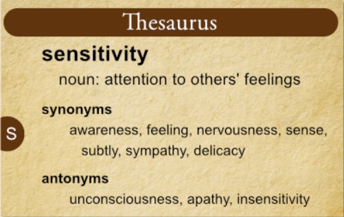 Based on the thesaurus entry, which words could replace sensitivity in the sentence below?Alexa was known for her sensitivity when her friends were having trouble.