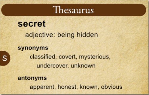Based on the thesaurus entry, which words could replace secret in the sentence below?The spy in the novel received a secret file from the government agency.