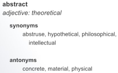 Based on the thesaurus entry, which words mean the opposite of abstract as it is used in the sentence below?The teacher started the class with physical experiments before moving onto more abstract concepts.