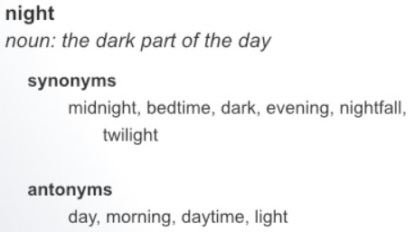 Based on the thesaurus entry, which words could replace night in the sentence below?Amy likes to stay home when it is night.
