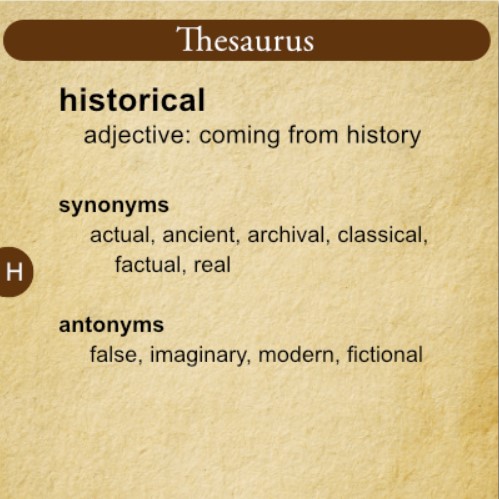 Click on the section of the thesaurus entry that shows words that have the same meaning as historical.