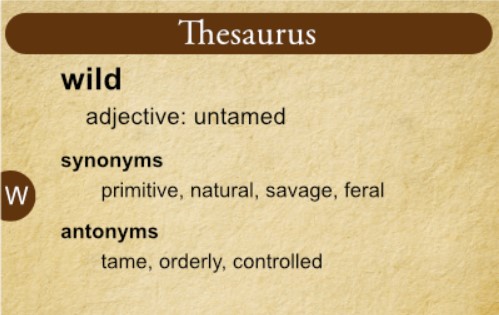 Based on the thesaurus entry, which words mean the opposite of wild as it is used in the sentence below?Ray discovered a wild badger raising its young near his campsite.